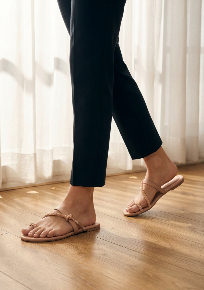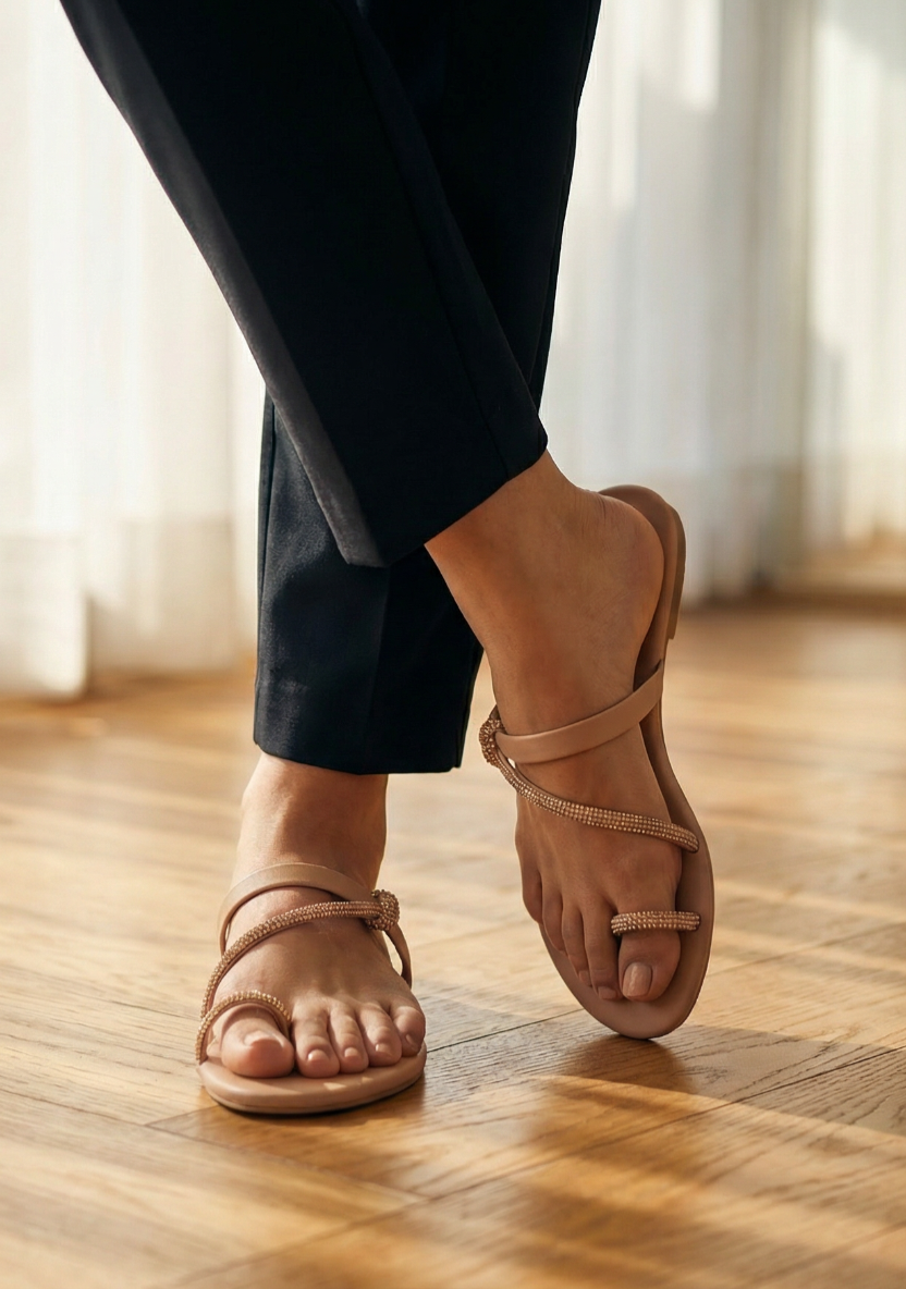 Delicate yet striking, Mira is designed for effortless elegance. Its minimalistic silhouette is elevated by slender, crystal-embellished straps that catch the light with every step. The toe loop detail adds a modern touch, creating a refined balance between sophistication and subtle allure. Crafted with a cushioned insole for all-day comfort, Mira is the perfect blend of delicate beauty and contemporary edge.